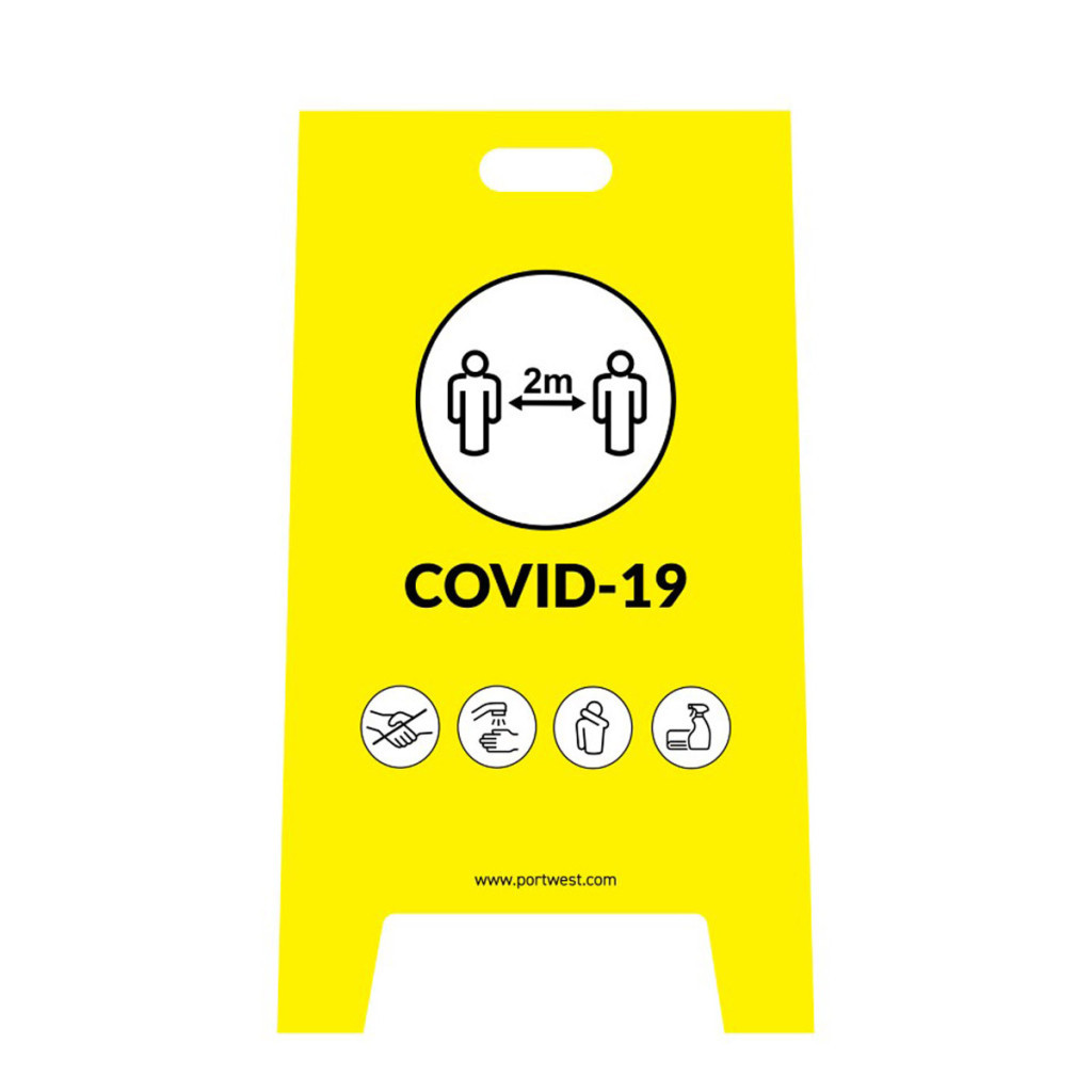 A Covid-19 biztonsági tábla sárga színének köszönhetően távolról is jól látható, és hatékonyan figyelmeztet a Covid-19 biztonsági előírások betartására. Összecsukható kialakításának köszönhetően kompakt és könnyen tárolható.
