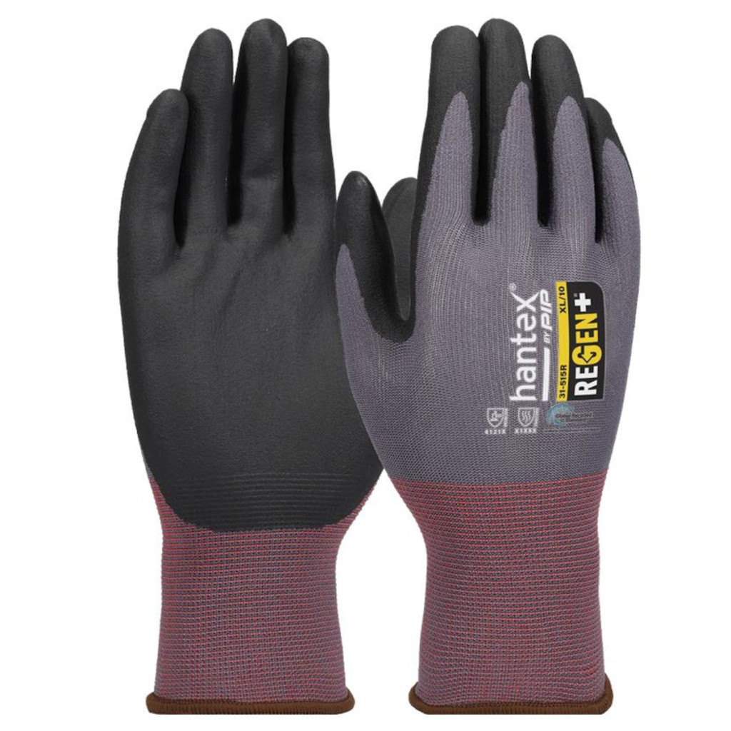 A HANTEX REGEN kötött, nitrilhab tenyérmártott munkavédelmi kesztyű 15-ös kötési sűrűséggel, 51%-ban újrahasznosított poliészterből készül, így fenntartható, kényelmes és jól szellőző védelmet nyújt nedves és száraz környezetben.